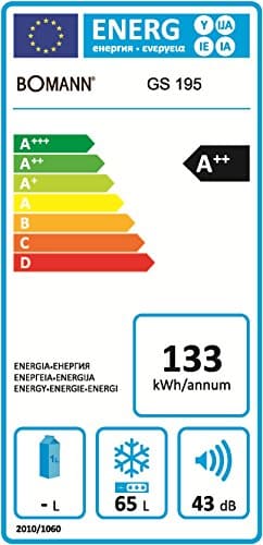 Mit dem Gefrierschrank können Sie in 24 Stunden rund 3,5 Kilogramm Lebensmittel durchfrieren. Zur Sicherheit wurde mit einer passenden Lagerzeit gearbeitet. Sollte der Strom einmal ausfallen und das Gerät nicht mehr betrieben werden, tauen die Lebensmittel im Inneren bis zu 12 Stunden nicht auf. Das ist zwar eine geringere Lagerzeit, als bei manch anderen Angeboten, doch für einen normalen Haushalt reicht das vollkommen aus. Unverzichtbar ist es ein Blick auf den Energieverbrauch zu werfen. Mit einer Anschlussleistung von 70 Watt sowie einer Energieeffizienzklasse von A++ werden Sie schnell glücklich. Je nach Verwendung kommen Sie durchschnittlich auf 133 kWh Verbrauch im Jahr. Ein Pluspunkt für die Umwelt ist, dass das umweltfreundliche Kühlmittel R600a verwendet wird. Deswegen ist der Bomann GS195 auch in der Klimaklasse N/ST zu finden. Mit einer Luftschallemission von 43 dB ist der Gefrierschrank recht leise, sodass Sie diesen in einem Nebenraum nicht mehr hören würden. Dieser Aspekt ist besonders wichtig, wenn Sie den Gefrierschrank permanent laufen lassen.